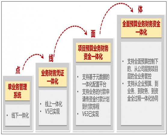 用友的业财一体化解决方案发展到今天,已经步入了4.0时代。在3.0的基础上,用友实现了业务、财务、资金、全面预算和税务的全面集成,形成了比较完善的行业业务与行业管理会计全面解决方案,在行业内处于全面领先的态势。