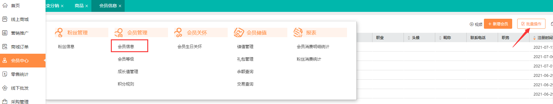 产品解决方案:微商城,点击【会员中心】-【会员信息】,点击右上角【批量修改成长值】,点击导入表格。