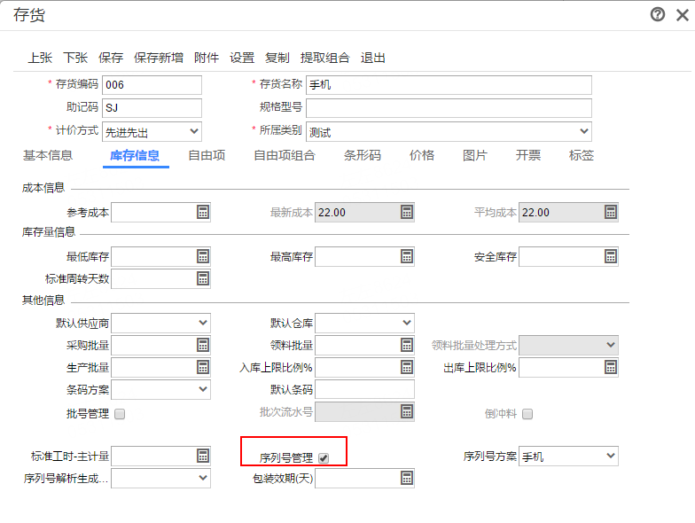 step.2 存货-库存信息勾选序列号管理