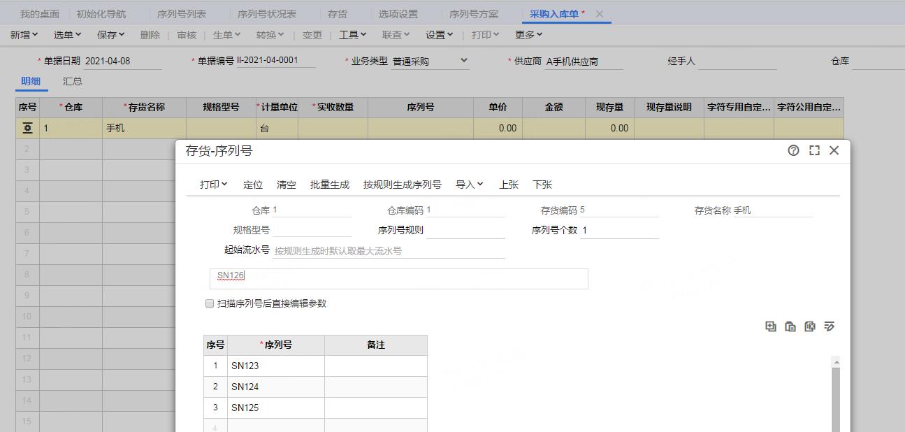 step.3 存货-序列号:入库记录商品每个库存独特标记