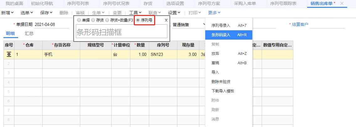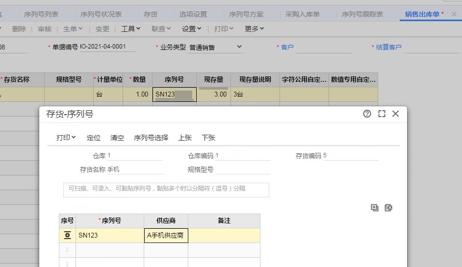 step.4 销售出库,扫描序列号,自动带出仓库,存货,序列号信息,实现快速销售,序列号录入中可以显示采购供应商;