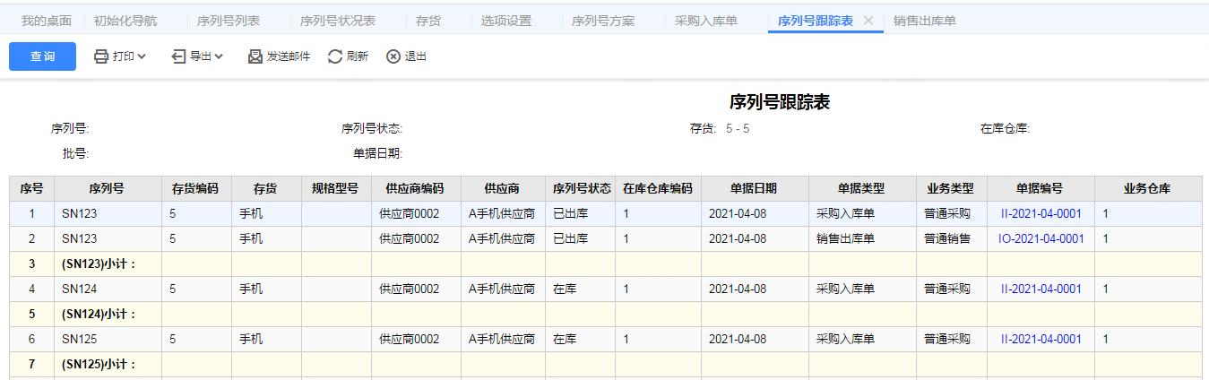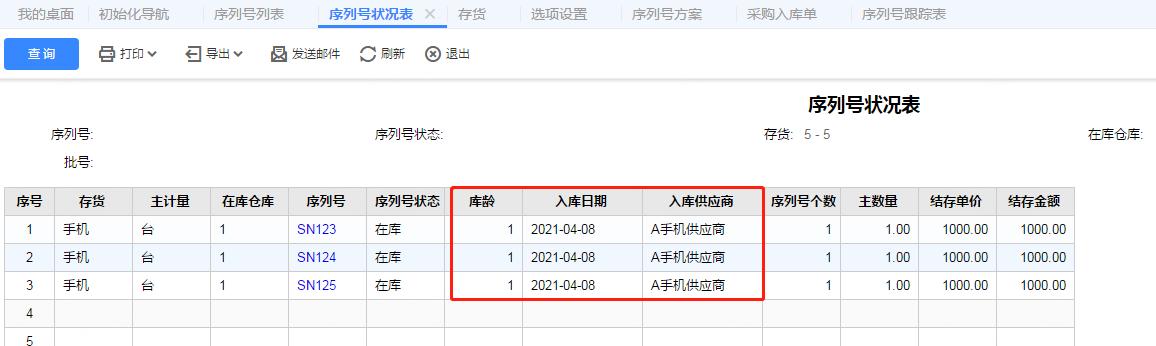 step.5 序列号状况表可以查询序列号的库龄以及采购供应商,对于在库时间较长的存货,可以采取一定的促销政策;