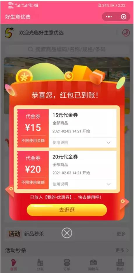 用户群体:新会员(首次进入微商城) 商品范围:可指定 发券方式:系统直接发放(不可手动领取)