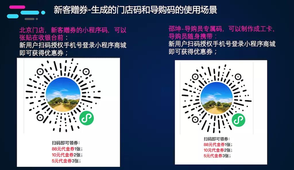 将活动生成的门店码或者门店拉新海报打印,张贴在收银台前,用户进店后,收银员引导用户扫码领券,用户扫码后进入小程序商城,授权手机号后,该会员即可获得优惠券,并且该会员所属门店为扫码的门店,如果扫描导购员的专属码,则会员所属门店为该门店且所属导购为该导购员。