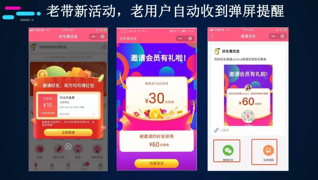 老用户进入微商城,自动会收到弹屏广告,邀请好友双方赠券的提醒,点击“立即邀请”即可进入活动落地页,并展示已经邀请成功的好友。邀请成功后,系统自动发券给新老会员。