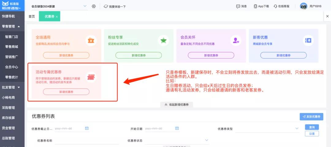 新增了一种“活动专属优惠券”,它跟前4种券不同,它只是相当于一个优惠券模板,并且发送的方式只能是系统发放,新建保存时,不会立刻发券,而是被活动引用,只会发放给满足活动条件的人群。