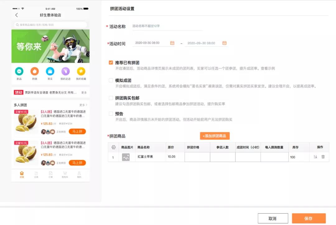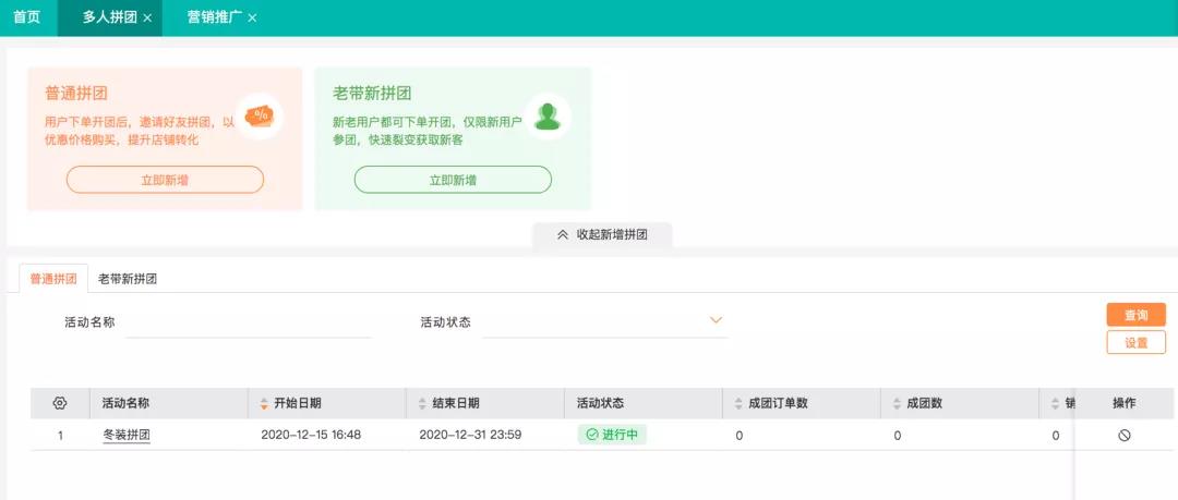 支持普通拼团和老带新拼团。二者的区别是,老带新拼团,参团的用户必须是新用户,而普通拼团没有限制。支持模拟成团,勾选模拟成团的活动,在拼团时间结束时,自动以匿名账户拼团,让拼团成功已有订单不自动退款。