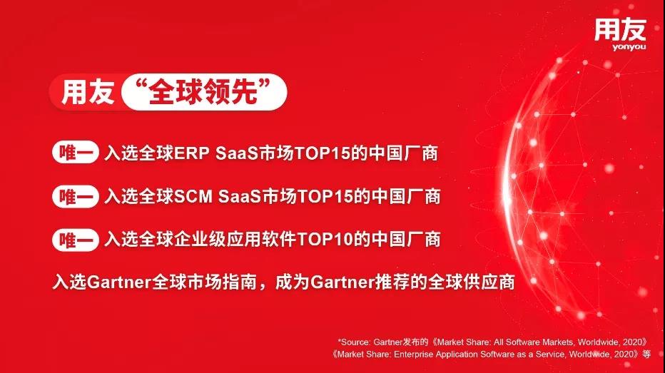 用友致力于用创想与技术推动商业和社会进步,通过构建和运行社会级的商业创新平台——用友BIP,服务企业数智化转型与商业创新,当前,用友位居中国企业云服务市场占有率第一、中国企业APaaS云服务市场占有率第一、中国企业应用SaaS市场占有率第一,中国云ERP市场占有率第一;同时,在ERP SaaS市场、SCM SaaS市场位列亚太区市场占有率第一,也是全球TOP15中唯一入选的中国厂商,是中国企业数智化服务和软件国产化自主创新的领导品牌。
