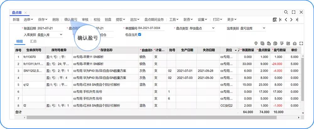 5.盘点完成后,在电脑端的盘点单上点击“确认盈亏”动作来统一计算盈亏,出现盈亏不平的需手工逐个商品行进行序列号盈亏生单确认;都调整完后审核盘点单;