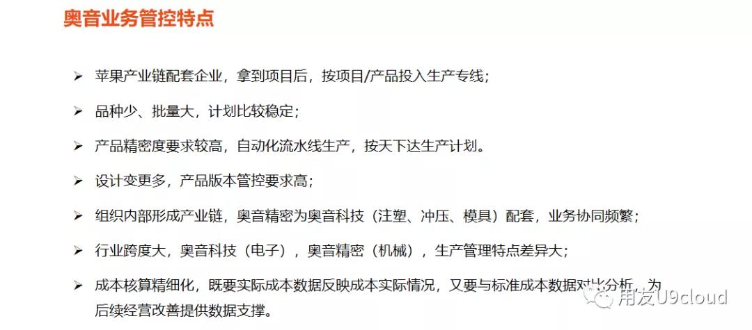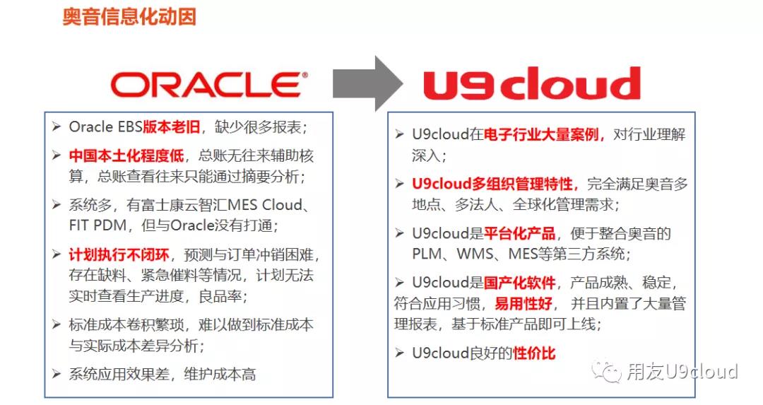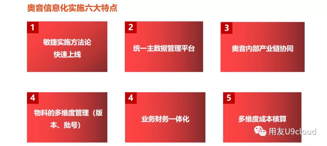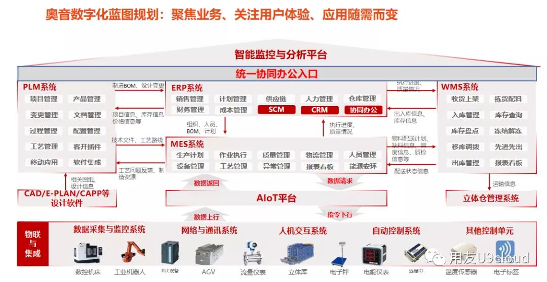 奥音科技与用友合作,使用U9 cloud替换Oracle,45天快速上线,U9 cloud一期涵盖技术、销售、生产、采购、库房、财务等业务流程,聚焦工厂运营效率,提高企业综合竞争力。