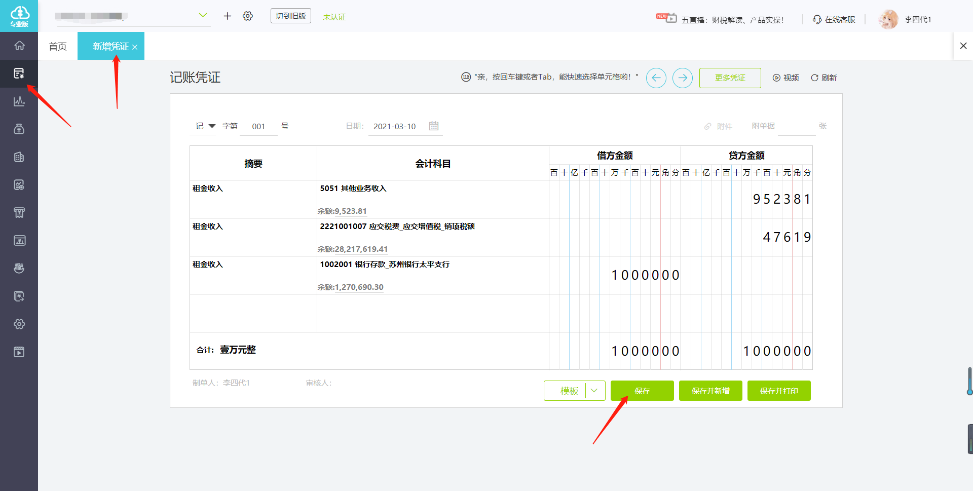 依次点击【总账】-【新增凭证】,手动录入业务的【日期】、【摘要】、【会计科目】、【辅助核算项目】、【金额】等信息,最后借贷方金额相等即可保存凭证。