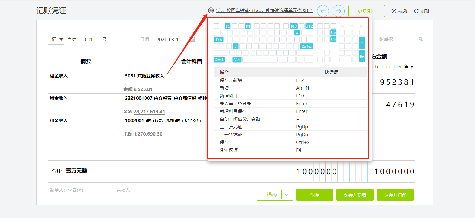 ④更多录入凭证的快捷键如下: