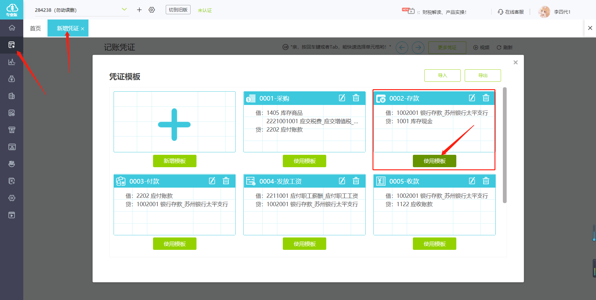 1.点击【总账】-【新增凭证】进入记账凭证页面,点击【模板】-【使用模板】或使用快捷键“F4”,调用已有的存款凭证模板。