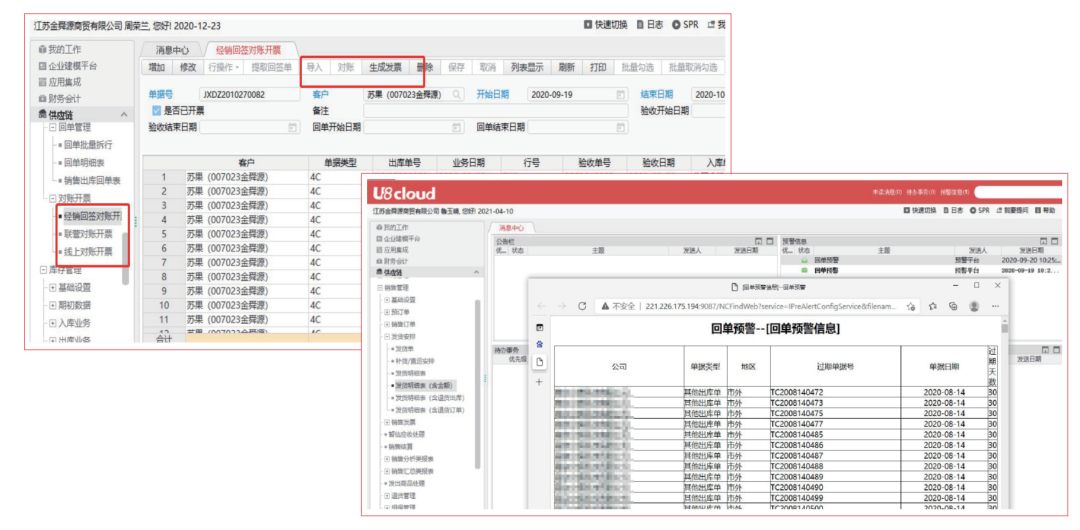 U8 cloud的实施应用,优化了金舜源采购流程、销售流程,加强了销售低价开单的管控、销售信用的管控、可用量控制的管控,实现了销售回签对账开票管理、销售回签预警功能。