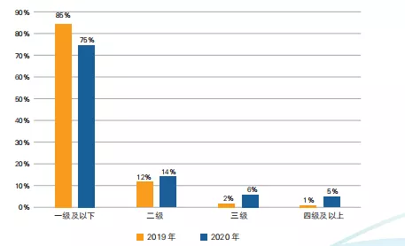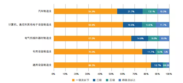 整体来看,2020年全国制造业智能制造能力成熟度较2019年有所提升。1级及以下的低成熟度企业数量减少了10%左右,三级以上的高成熟度企业数量增加了8%左右。值得一提的是,参与自诊断的中小企业占比达到了87%,其更专注于细分市场,专业化生产、服务和协作配套能力是企业发展的核心,聚焦产品质量和生产效率的稳步提升仍是我国中小企业提高核心竞争力的重要突破点。